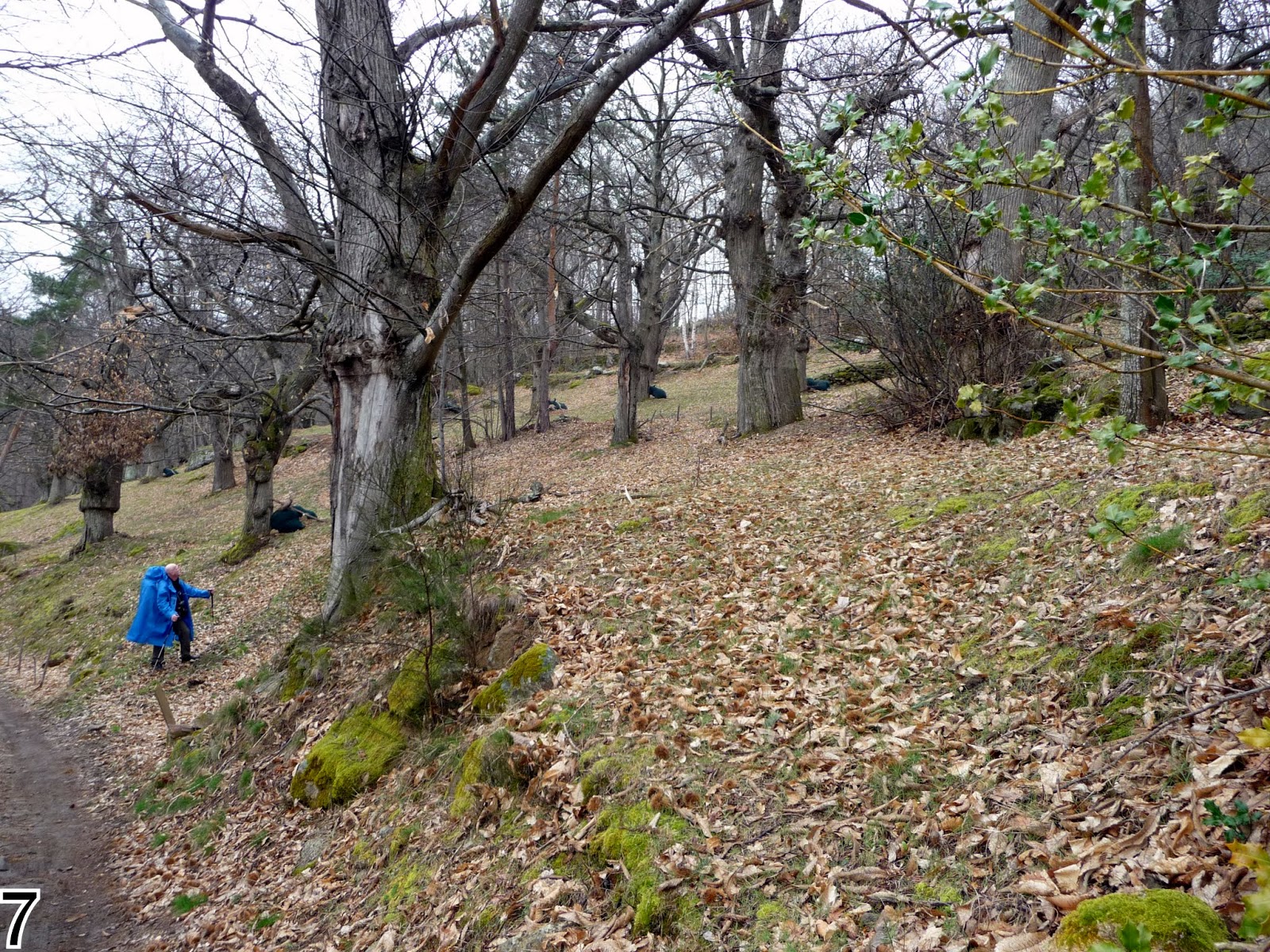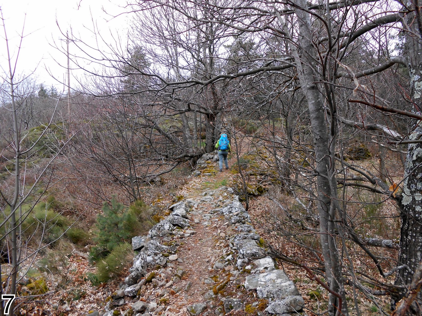 Départ avec passage à la table d'orientation, située au sommet du village et nous prenons le chemin qui emprunte les fondations des anciens remparts du château. La montée continue sur des chemins bordés de murets de pierre et de frênes lorsqu'il se met à tomber de la neige fondue. Nous sortons pour la 1ère fois les capes de pluie qui vont nous protéger également du froid !
