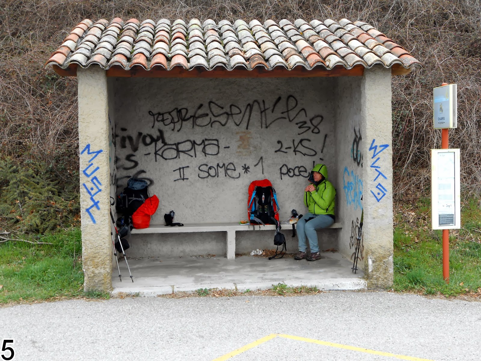 Notre pause repas au col de Leyrisse, dans un abri-bus tagé mais à l'abri de la bise, nous laissera un souvenir d'hiver !