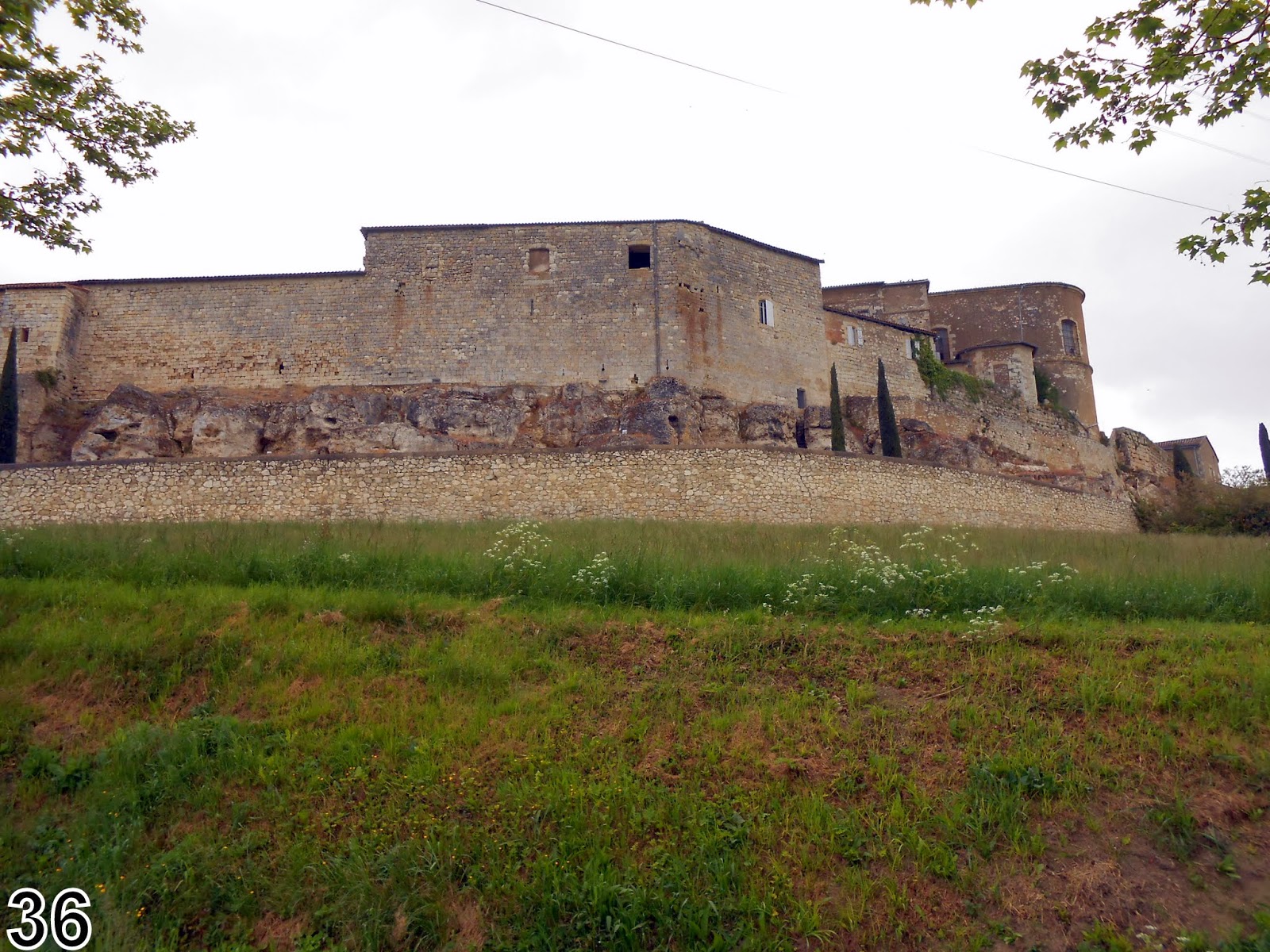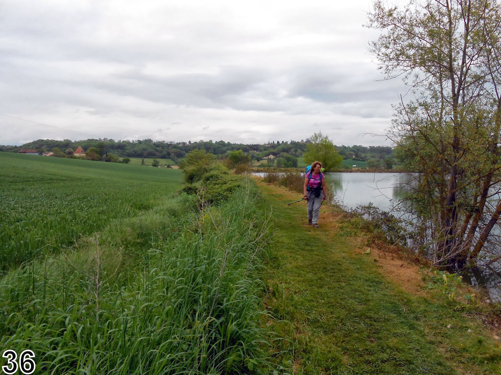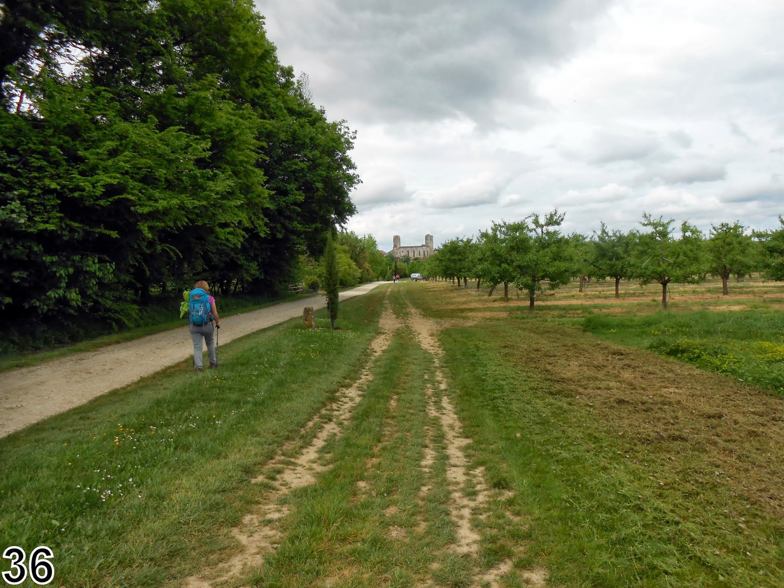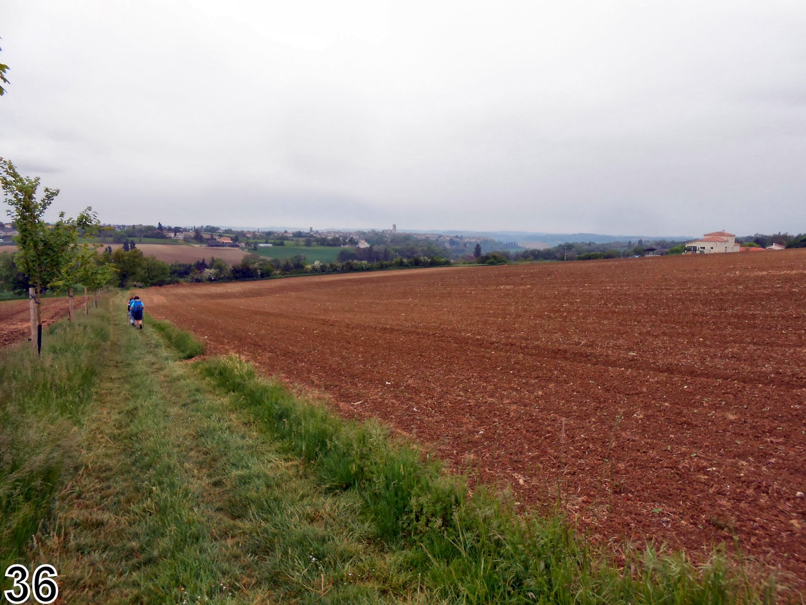 Sur le GR nous retrouvons Daniel et Bernadette et marchons avec eux jusqu'à Lectoure. Sur la place devant la belle église de nombreux pèlerins musardent. Les uns cherchent à se ravitailler, d'autres visitent, certains se reposent ... nous sortons de la ville avec Xavier et retrouvons les typiques retenues d'eau de ravinement au pied des collines. Nous apprenons que ces cultures sont destinées à la récolte de semences.