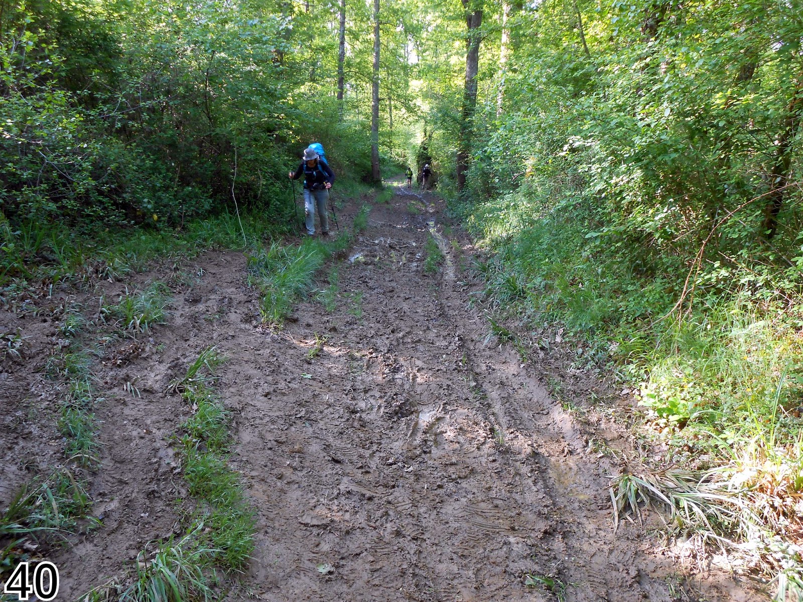 Nous retrouvons les chemins boueux, l'occasion pour Geneviève de tomber pour la 3ème fois ! le poids du sac l'empêche de se relever, le jeune grenoblois qui se trouve derrière elle l'aide.