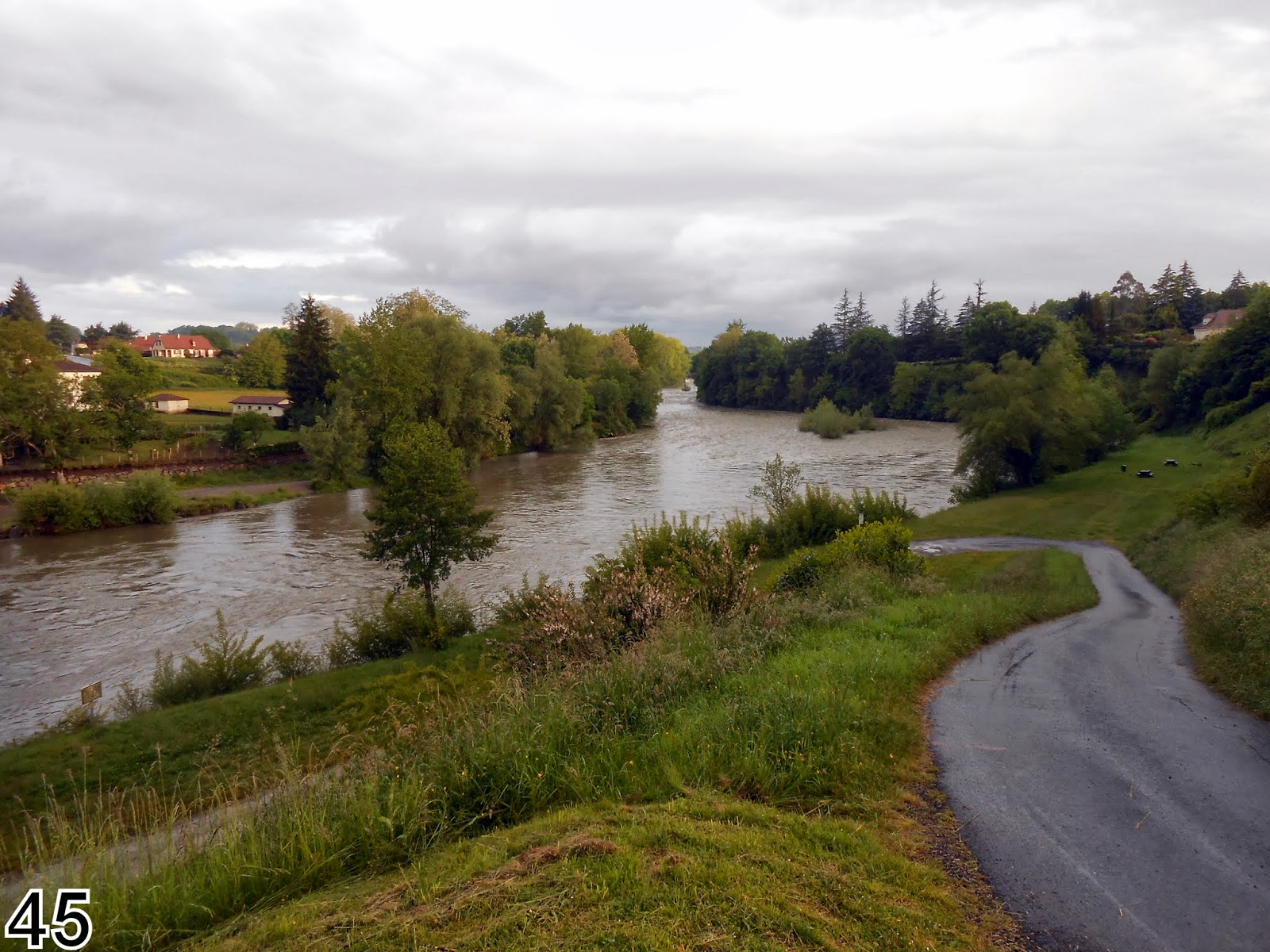 Nous quittons la ville en compagnie d'Alexandre, par une porte fortifiée, encore sous la pluie, et passons le pont sur le Gave d'Oloron en crue, direction Castelnau en empruntant un chemin ... boueux !