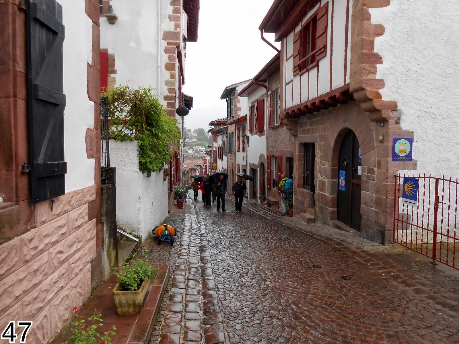 Il a plu toute la nuit sans discontinuité. Après seulement 4 km de route, sous la pluie, nous arrivons à St Jean Pied de Port et nous dirigeons immédiatement au bureau de l'association afin de réserver notre nuitée à l'accueil Saint Jacques, où officie toujours la célèbre Jeanine malgré une retraite acquise de longue date !