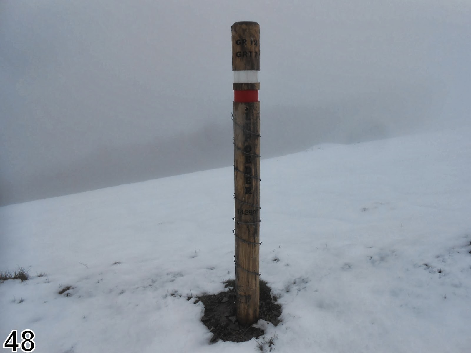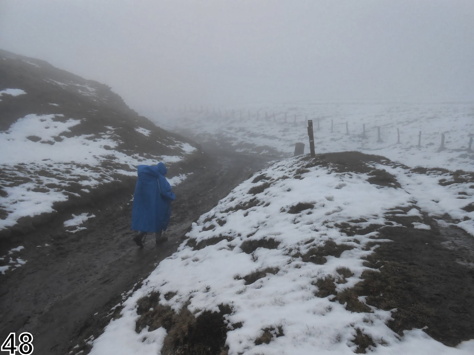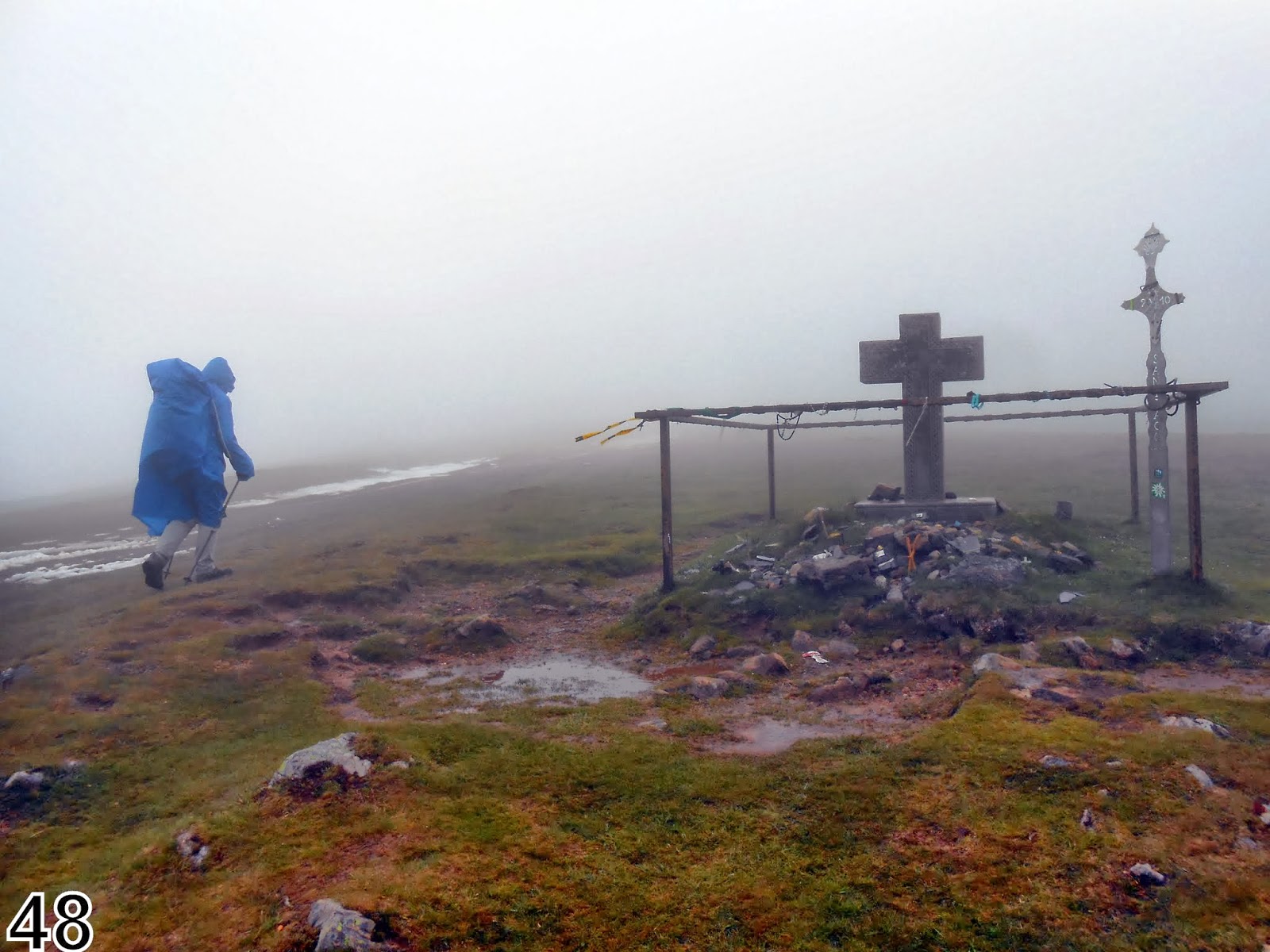 Puis nous sommes cinglés par une tourmente de grésil suivi d'une pluie froide qui nous fait sortir les capes rapidement. Plus nous montons nous trouvons une neige mouillée qui trempe nos chaussures. Nous franchissons la frontière dans des nappes de brouillard qui s'effilochent laissant entrapercevoir le sommet.