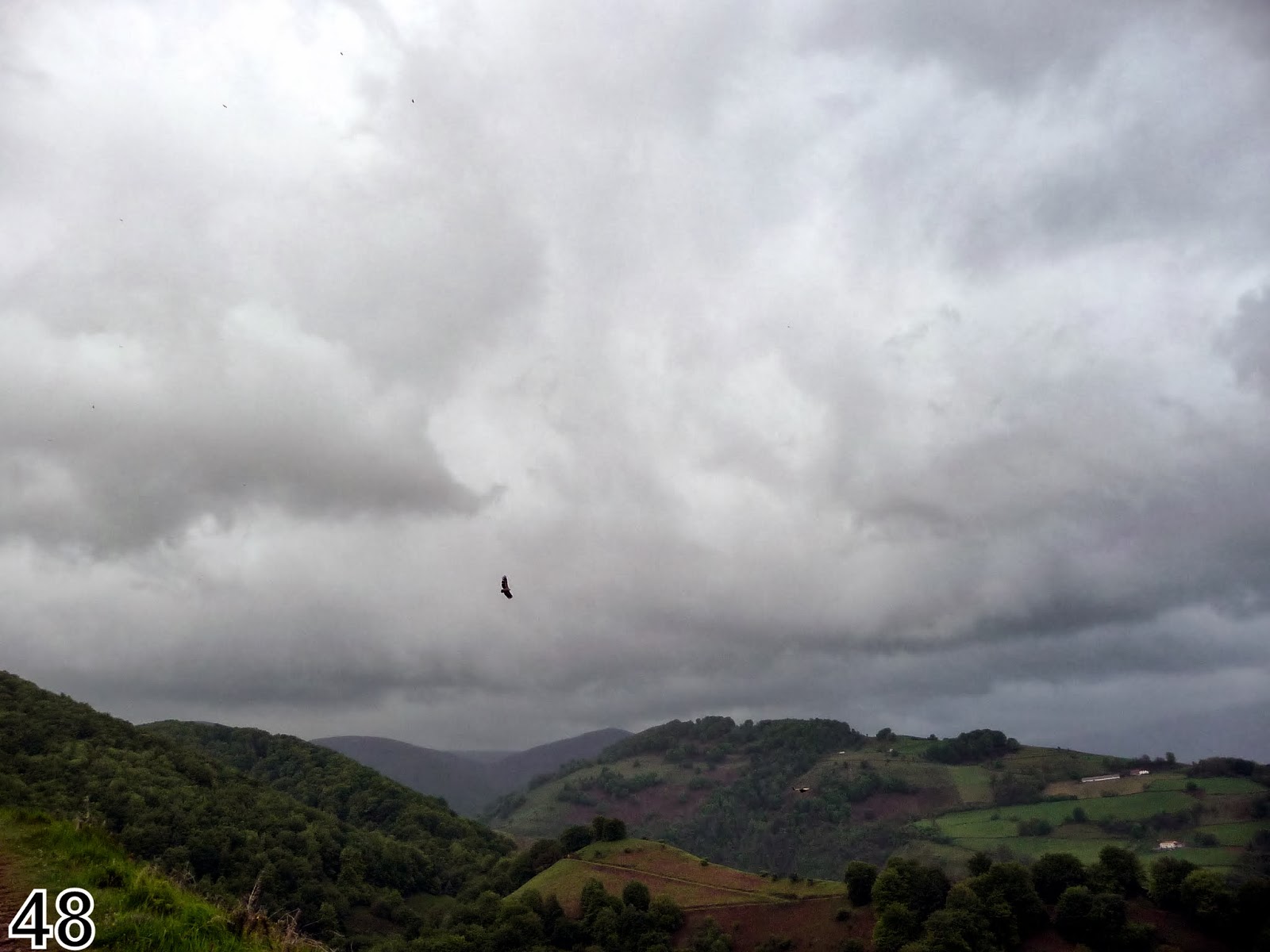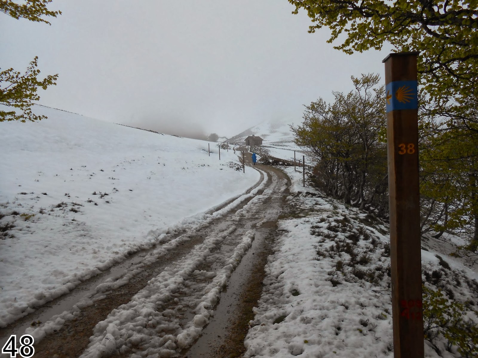 Nous ne sommes pas nombreux à prendre cet itinéraire, la première partie sur petite route au fort dénivelé se fait sous un ciel changeant et menacant. Au refuge d'Orisson le gardien nous rassure : plusieurs personnes sont partis du refuge ce matin, et malgré la neige probable nous pourrons suivre leurs traces plus haut !