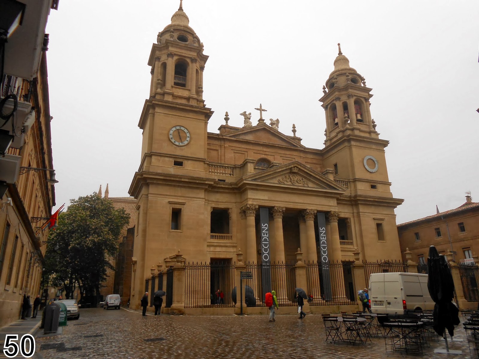Longue traversée urbaine de 4.5 km, une température de 6° et la pluie qui revient, jusqu'à l'enceinte de la vieille ville. Nous passons les remparts pour arriver devant la cathédrale. Nous sommes étourdis par l'affluence, les travaux, la circulation et sortons vite de ce passage urbain.