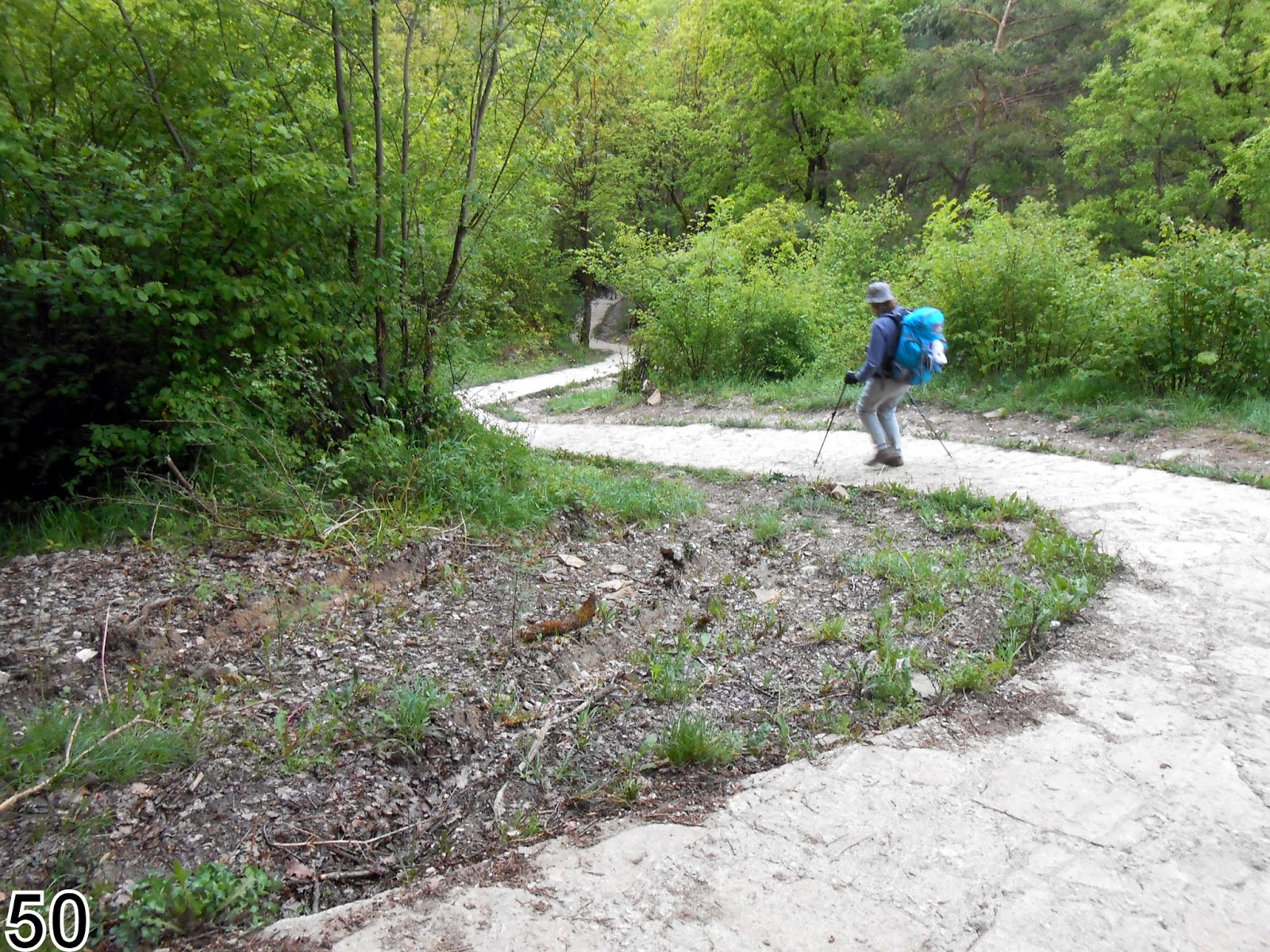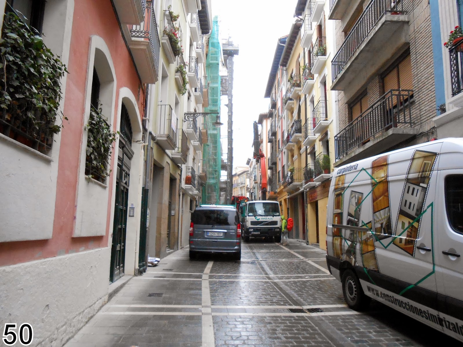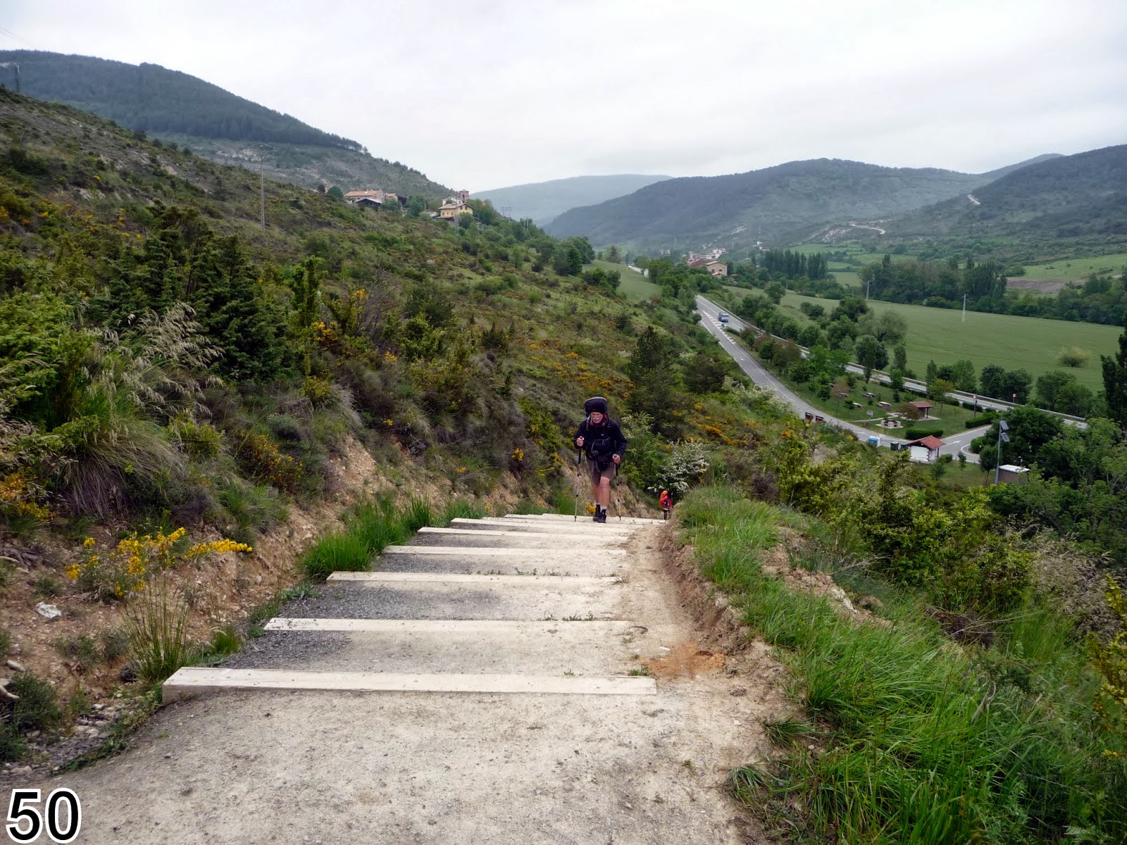 Sortie de Larrasoana par un beau pont médiéval et nous rejoignons le GR pour un tracé qui longe la rivière sous les pins, il ne fait pas chaud (gelée blanc !). Après avoir traversé à nouveau la rivière nous suivons une route à grande circulation avant d'atteindre une aire très bien aménagée avec sanitaires, barbecue, tables et bancs. Une rude montée aménagée nous mène à flanc de colline que nous suivrons jusqu'en banlieue de Pampelune.