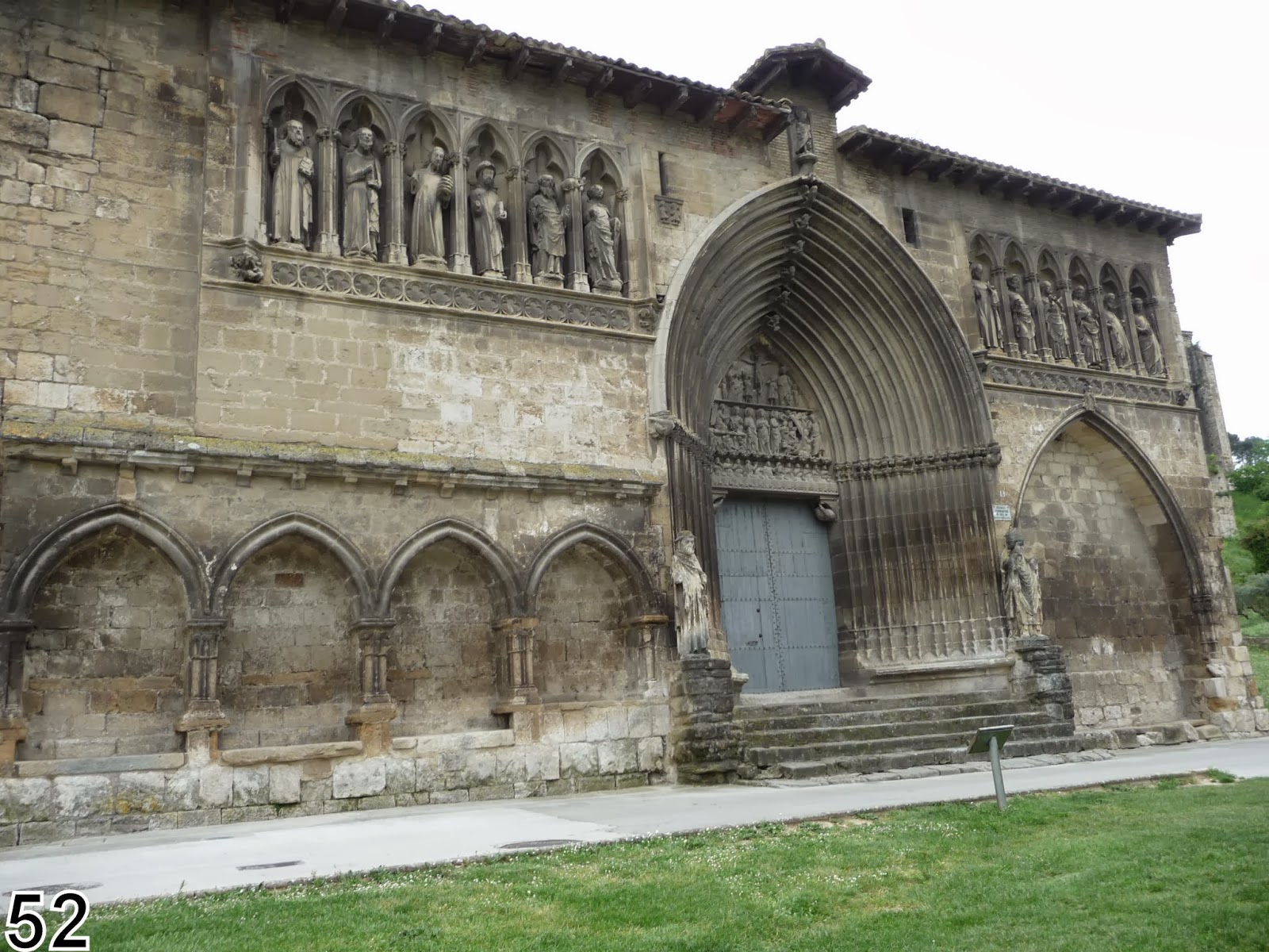 Passage de Estella-Lizarra, avec sa 1ère église au fronton lourdement chargé de statues, puis son église fortifiée où on nous proposera un tampon sur notre créancial pour 1 € !