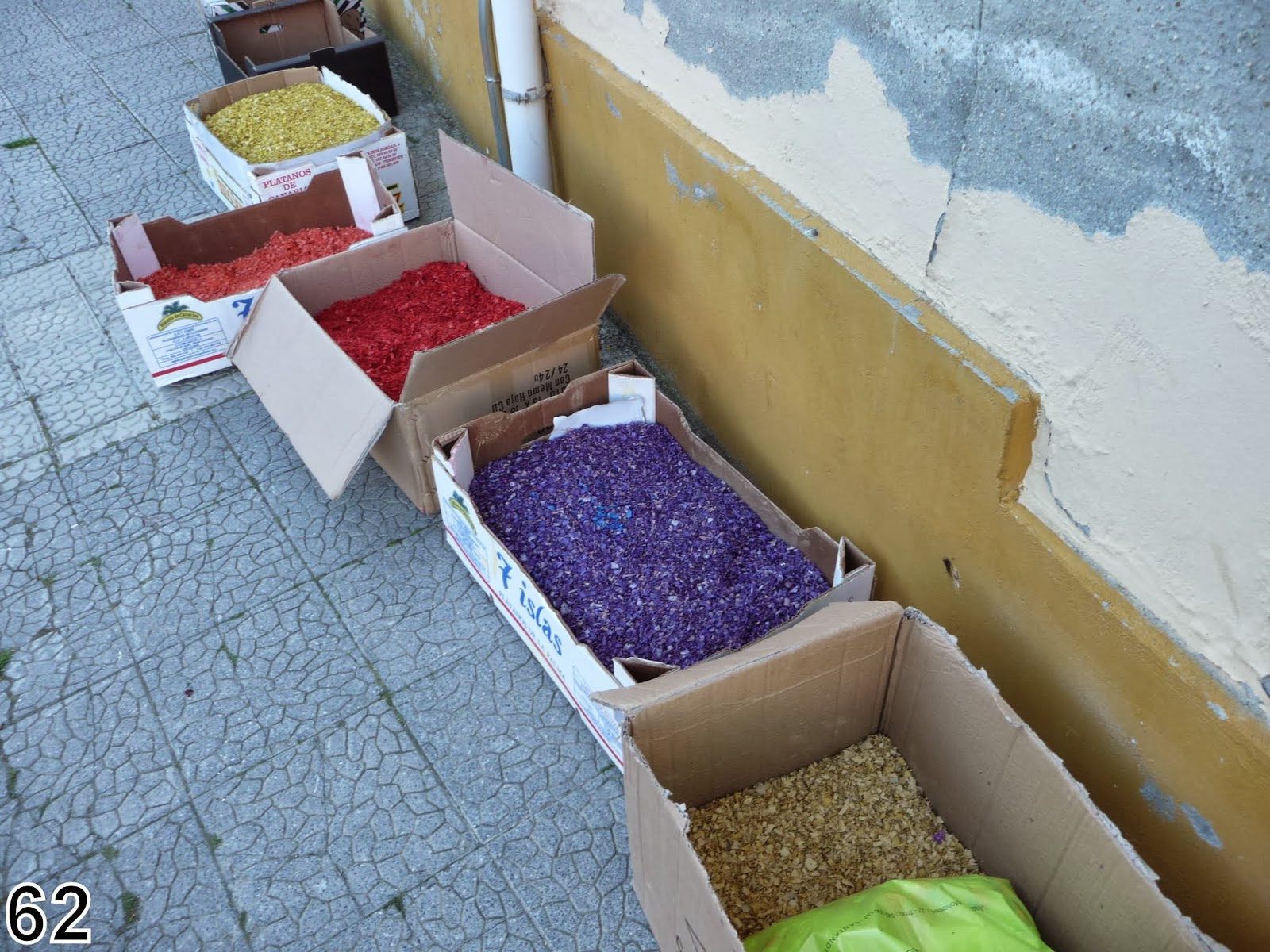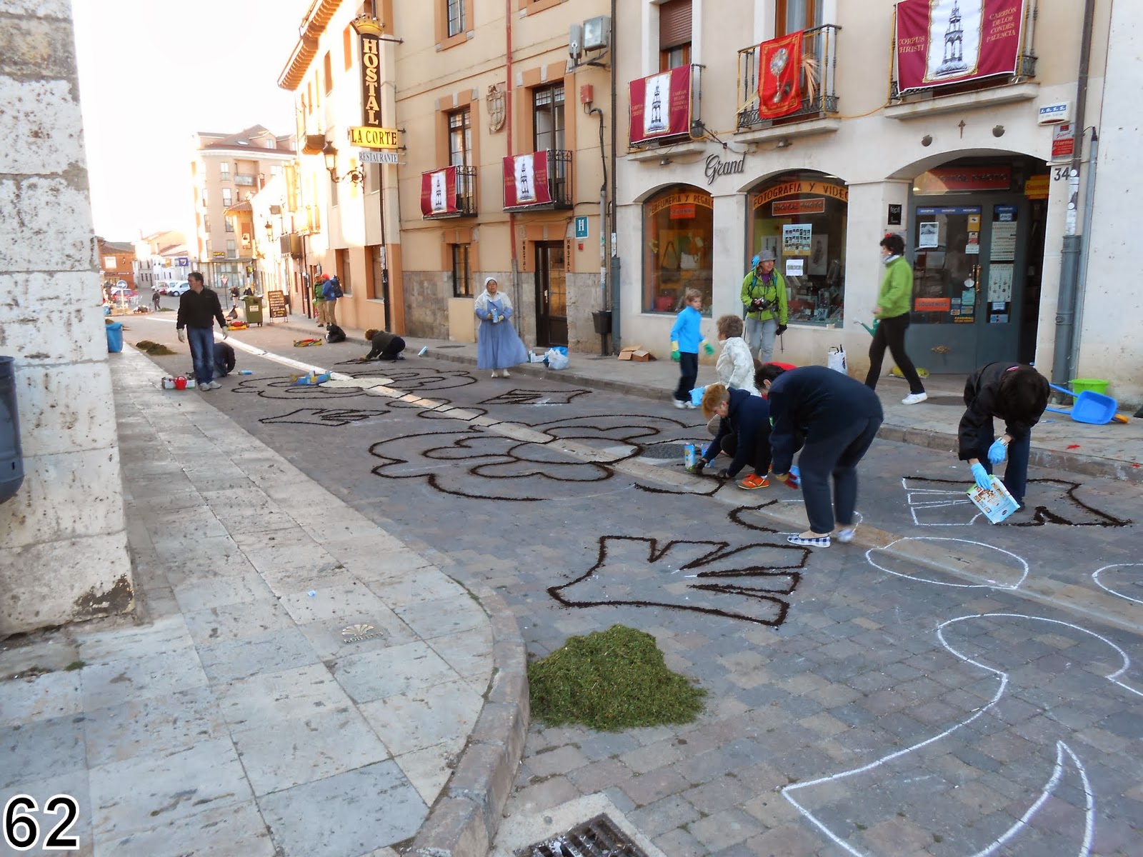 Après préparation de notre petit déjeuner pris à la cuisine, nous quittons les soeurs et traversons les rues en pleines activités de décorations florales. Les riverains, malgré le vent glacial, s'activent à réaliser les fresques, tracées la veille à la craie. Tout doit être prêt en fin de matinée pour le passage de la procession religieuse. On quitte à regret la ville avant la cérémonie, car le chemin nous attend !!!