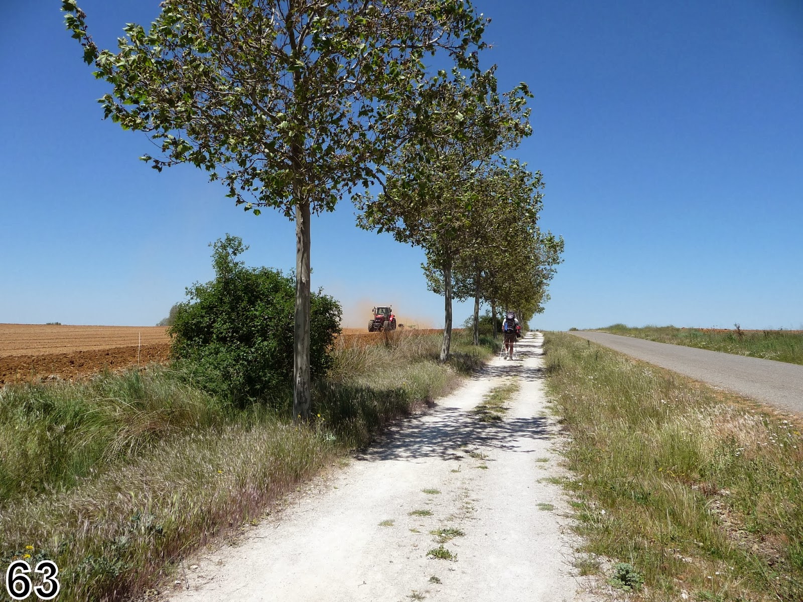 Nous longeons ensuite une zone humide où se régalent les cygognes ; nous marchons avec Marc et Cécile sur 10 km puis nous les quittons après la pause barre énergétique pour continuer jusqu'à Bercianos del Real où Jean craque pour un bocadillos et un café con leche. Les villages sont dorénavant en pisé !