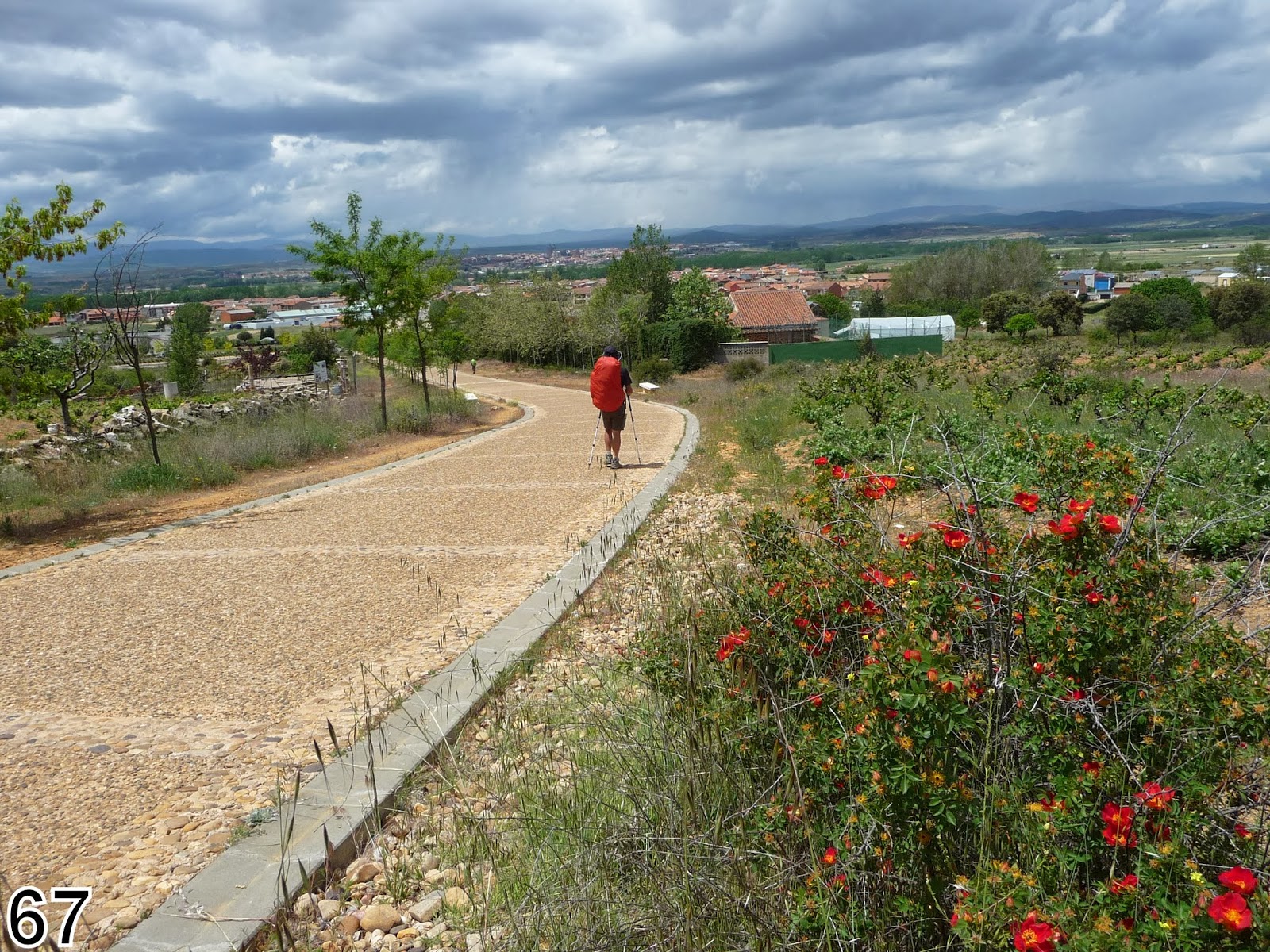 Longue traversée d'une zone boisée, nous passons devant une ancienne carrière colonisée par de nombreuses hirondelles de falaise, encore un plateau aride au bout duquel se dresse une immense croix dominant, au loin Astorga. Longue approche de la ville par un chemin aménagé traversant un village, avant d'accéder à notre ville étape.
