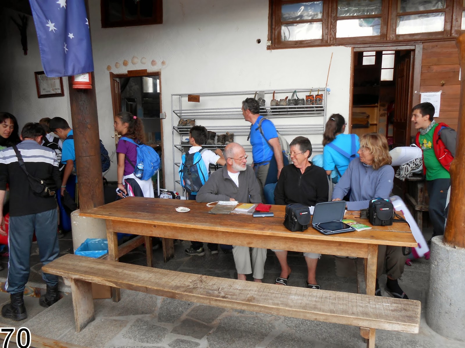 Notre choix est le bon, ambiance conviviale, chaleureuse et décontractée malgré la rusticité des lieux et la non mixité dans les dortoirs hormis pour les couples ! nous partageons donc la même chambre avec Claudie et Christian. Nous découvrons plus tard qu'il s'agit de la chambre "ronfleurs" .... surprise lors de la toilette : de simples rideaux de douche à la place des portes et pour certains la chasse d'eau remplacée par un seau à remplir au robinet extérieur !!!
