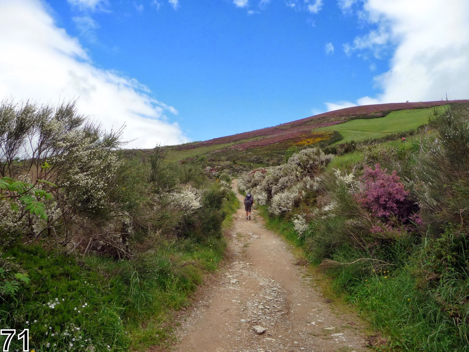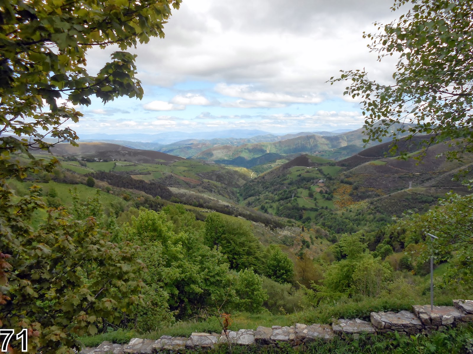 A Lo Herrerias nous quittons le fond de vallée pour entreprendre une rude mais belle montée dans les arbres pour arriver à La Faba hameau à 900 m, puis à La Laguna à 1 200 m où une pause coca s'impose ! Des fleurs à profusion, une belle vue sur la vallée de Ponferrada et entrée en province de la Galice.