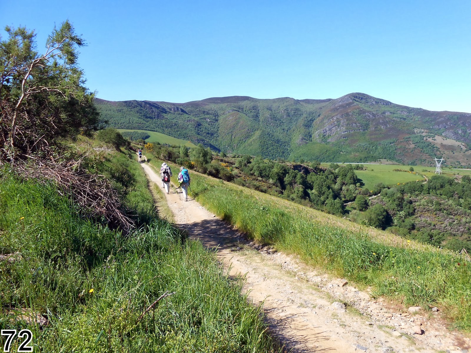 Paysage très aérien jusqu'à la célèbre statue de l'alto del Poyo à 1 335 m, puis descente avec passage dans de petits villages authentiques, dans l'un d'eux nous dégustons un café con leche offert par nos compagnons, au son d'une musique celte qui réjouit nos bretons, les poules picorent les miettes !!!
