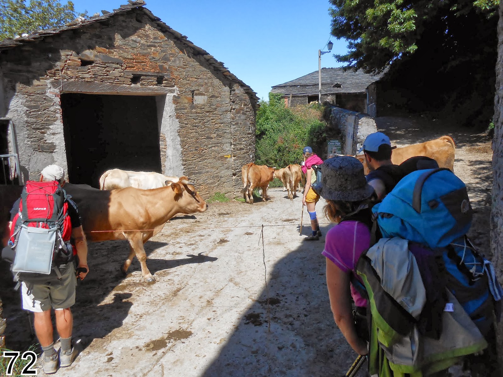 A un moment nous dépassons un troupeau de vaches et son taureau. Enfin arrivée à Triacastela où nous laisserons les bretons qui ont choisi de s'arrêter là ; nous faisons les courses et pique-niquons. Après réflexion nous décidons de trouver un hébergement sur place. Notre choix se porte sur une chambre individuelle à 2 lits avec draps de quoi se remettre de nos nombreuses nuits collectives. Une lessive à la machine couronne ce luxe.