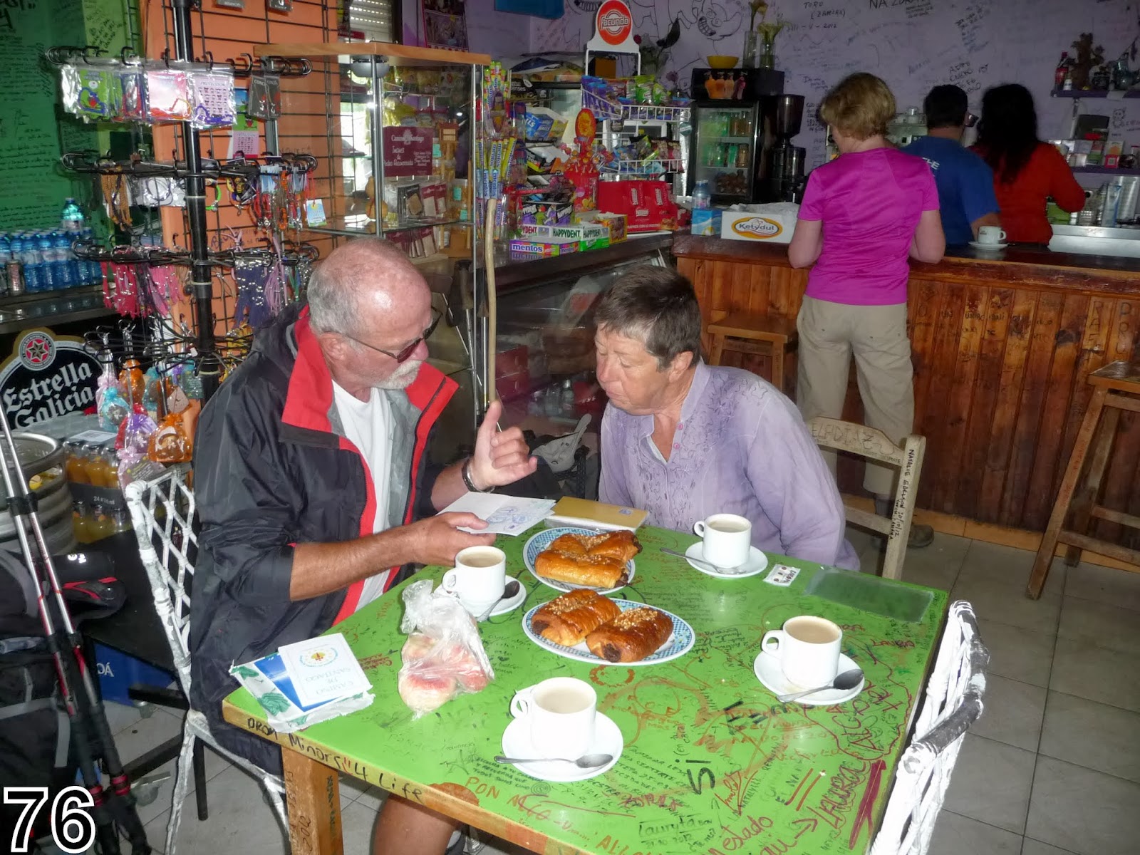 Nous marchons jusqu'au km 25 où nous trouvons "la maison verte", établissement très fréquenté par les pèlerins qui en assurent la décoration par des graffitis qui ornent tables et chaises, murs et plafond et une collection de tee-shirts abandonnés là. Le bar est bondé et nous n'auront que des pains au chocolat de la veille mais à moitié prix ! on se régale malgré tout.